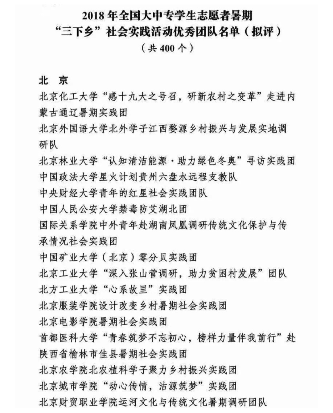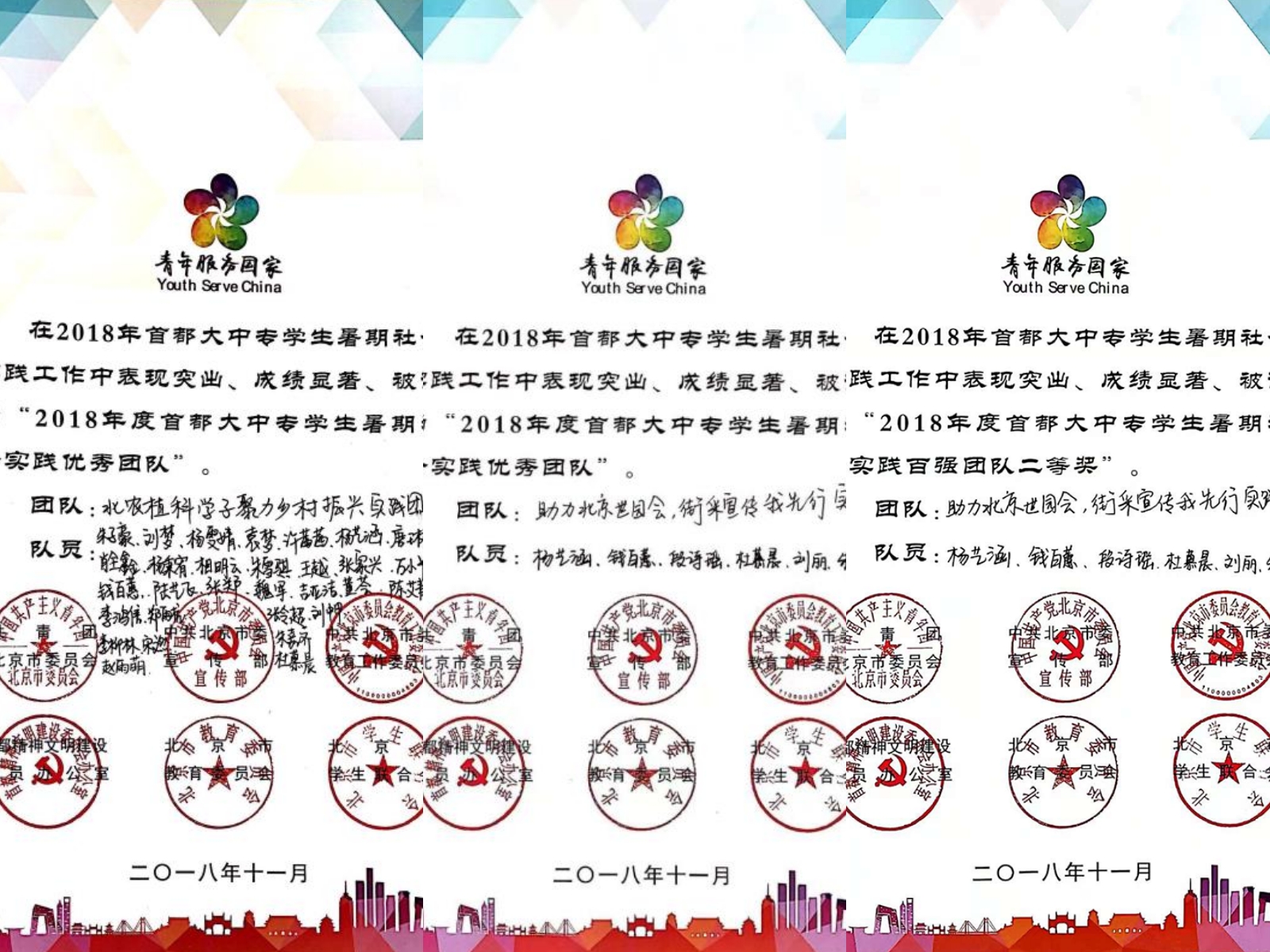 2018年度首都大中专员工暑期社会实践优秀团队:betway西汉姆联“助力北京世园会,街采宣传我先行”实践团;betway西汉姆联 “北农植科学子,聚力乡村振兴”实践团