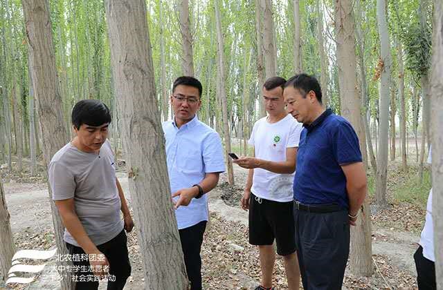 接下来,实践团成员与彭局长来到当地流沙河旁的杨树林。一行人观察到林中的杨树遭到光肩星天牛的破坏。天牛在处于幼虫阶段时会蛀食树干,易引起树木枯梢和风折,一棵树在很短时间内就可以被蛀空。对于这一现象,可以利用啄木鸟控制天牛的生物防治方法,但是新疆独特的自然条件不适合啄木鸟生存,由此张杰教授提出用生石灰和硫磺相同比例的物理防治方法对树干底部进行粉刷,或者利用注干、打孔施药的方式进行药物的防治。