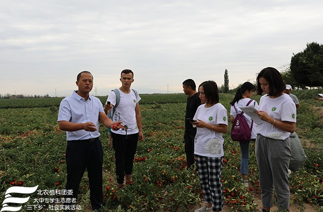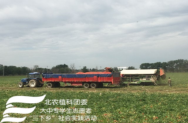 25日下午实践团成员来到幸福村绿色食品原料加工番茄生产基地,该基地利用生物降解膜的自动降解特性减少白色污染,张杰老师介绍到该降解膜还有“保水、保肥、增加地温、防治杂草”的作用,适宜新疆干旱的气候。依据加工番茄果皮厚实的品种特性,运用大型机械收割的方法来降低生产成本。该村还大胆进行产业结构调整,试种甜叶菊及黄芪两种经济效益更高的作物,来实现该村农业多样化发展。