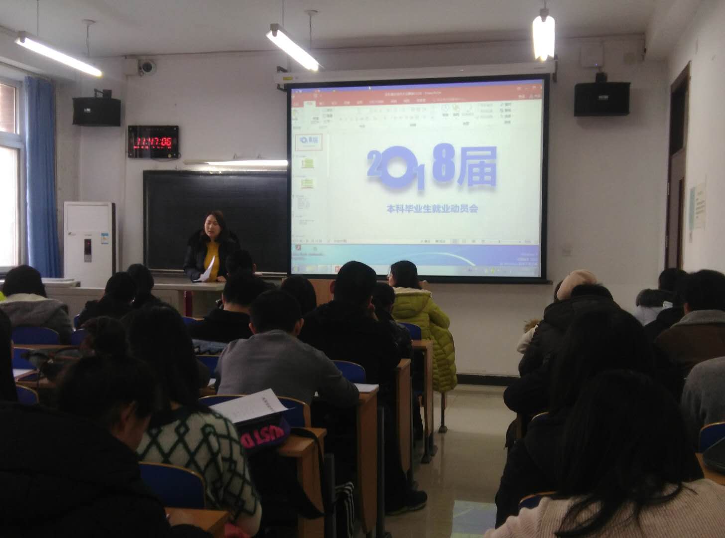会上牛奔老师结合17年植科各专业的就业情况,指出在当前严峻就业形势下,广大毕业生应根据自身的特点,积极转变就业观念,认清就业形势,培养自我意识,把握好就业机会、增强竞争择业和服务基层的观念,遇到挫折时要正确面对,调整好心态,积极就业,以最佳的状态去迎接崭新的明天。