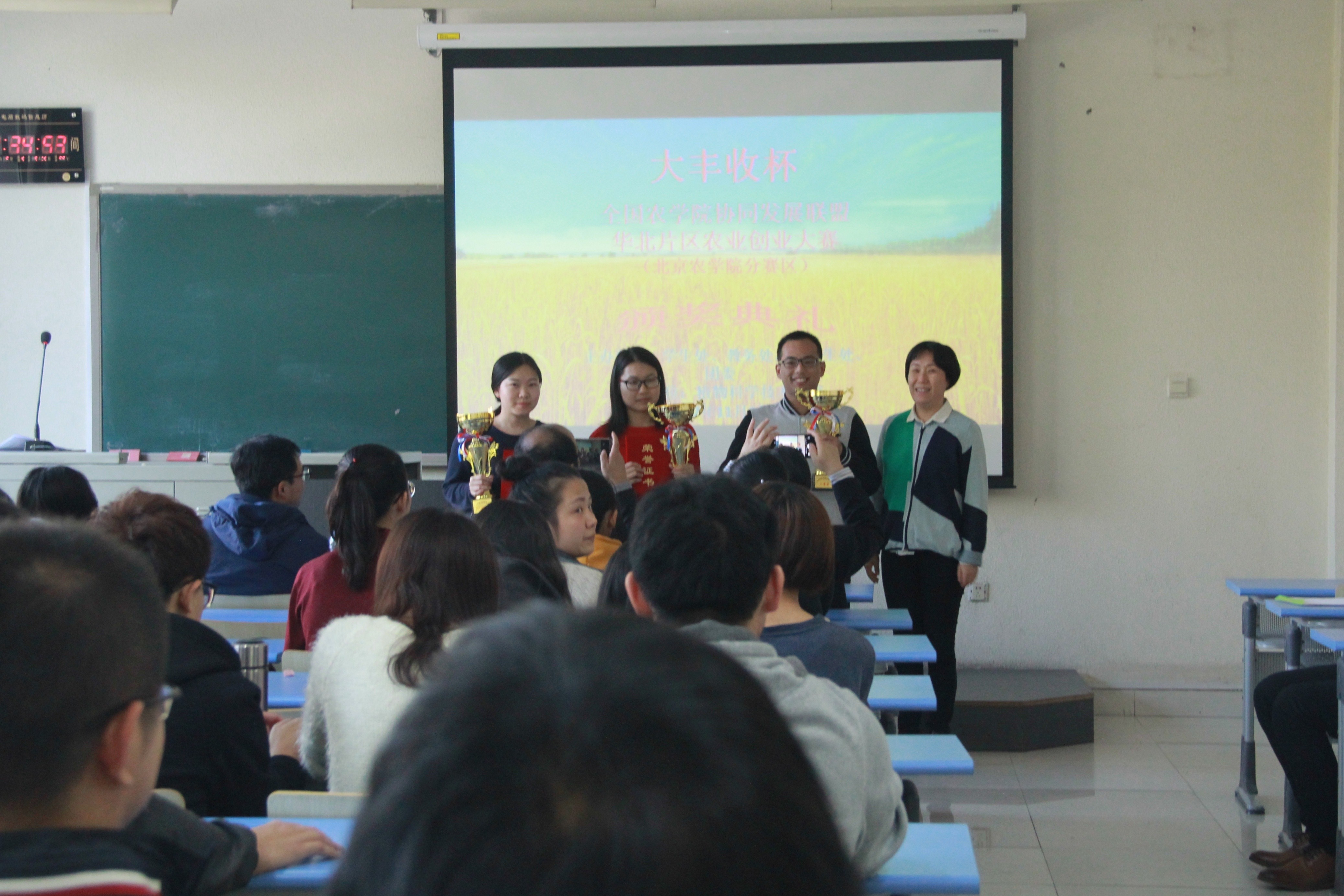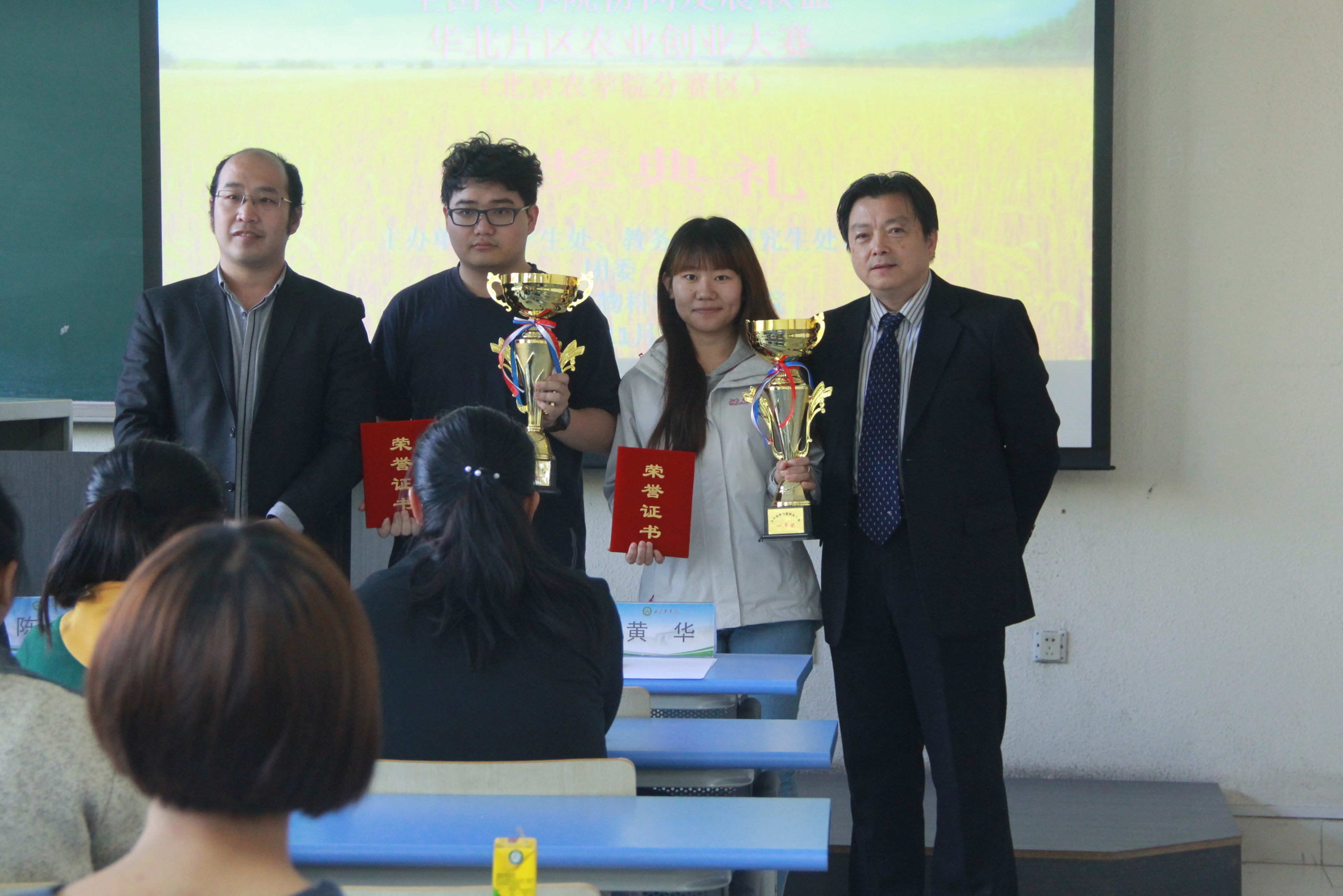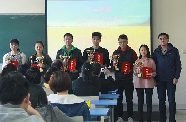 首届“大丰收杯——全国农公司协同发展联盟华北片区农业创新创业大赛(betway西汉姆联分赛区)”于10月26日圆满举办。经过6个公司,15个创新创业项目团队的精彩答辩,共产生一等奖两个,二等奖三个,三等奖六个。由黄华、黄杰、赵晓萌、陈勇四位老师分别为一、二、三等奖的同学颁奖,台下爆发出热烈的掌声。