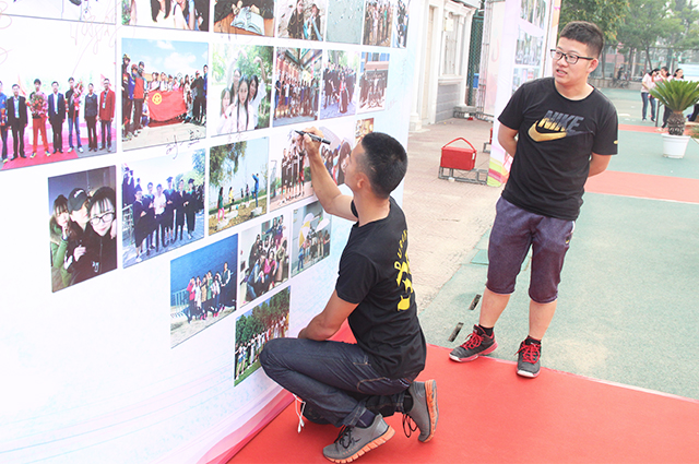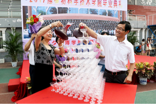 接下来,王绍辉书记与潘金豹经理将对毕业生的寄语化作涓涓细流倒入香槟塔。在一片欢呼与掌声中,大家共同举杯,现场气氛达到高潮。老师们共同切开蛋糕,与到场同学们一同分享毕业的喜悦。此系列活动进行的同时,毕业照片墙的签名与水果自助也在舞台两侧有序进行着。