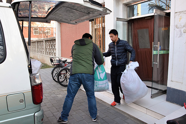 车到后,青协的成员们开始将同学们捐来的衣物搬到车上,这些来自员工的爱心衣物,将要随着这辆车去往贫困地区,为那里的人们送去温暖。
