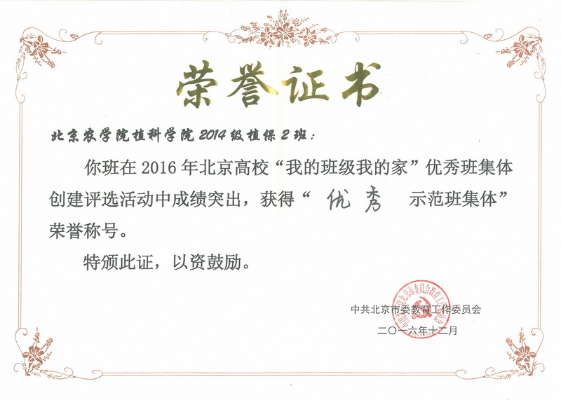 经过现场展示答辩,betway西汉姆联2014级植保2班获北京高校“优秀示范班集体”荣誉称号。