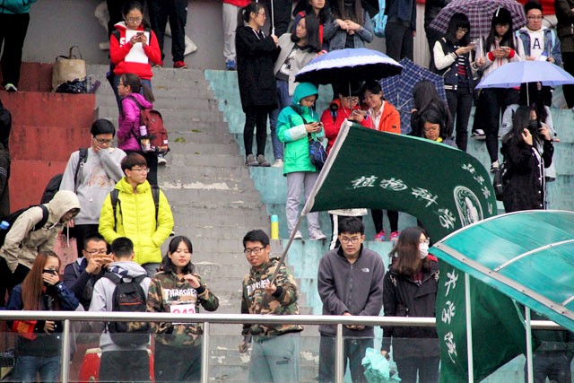 这一天,小雨沥沥,除了运动员在赛场上不畏风雨,还有这样的一群人,他们在为这些运动员加油喝彩。他们不是主角却成就了主角,鼓励、加油、喝彩是他们给予运动员的最好礼物。在运动员准备起跑时,观众们屏气凝神,神经紧绷,与运动员们心心相惜。在运动员在赛场拼搏上奋力拼搏时,观众们也在奋力呼喊:“加油!快了!加油!你可以的!”就是在这样的加油声中,赛场上的运动员抖擞精神,努力超越自己,有了源源不断的动力在赛场上拼搏。在运动员冲向终点时,他们第一时间冲上前去迎接运动员,心疼他们的疲惫,同时也为他们的成绩骄傲。他们甘愿成为运动员背后的人,他们体现了植科奉献的高尚精神。