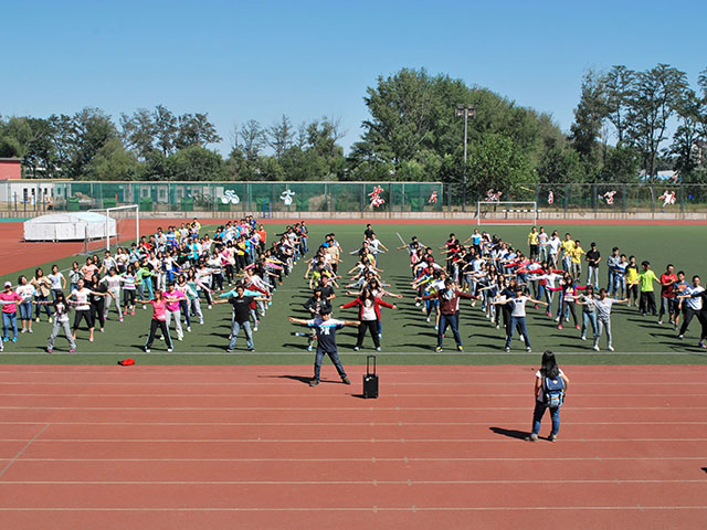 烈日下,伴随着欢快的音乐声,同学们尽情挥洒汗水,脸上洋溢着舞动的笑容,一个个宛如初升的太阳一样充满活力,朝气蓬勃。