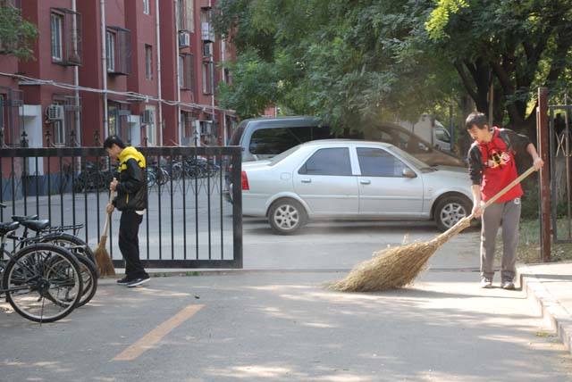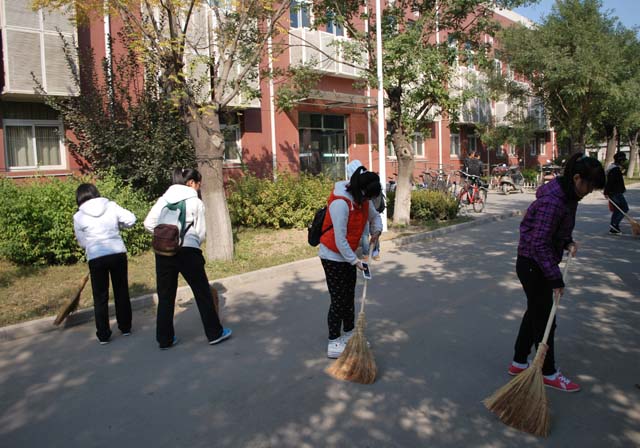 秋风瑟瑟,寒气袭人。同学们挥舞着手中的扫把,积极、认真的清扫着地上的垃圾。秋风阵阵吹过,不断地卷起地上的落叶,吹乱同学们的劳动成果,他们又耐心地重新清扫。
