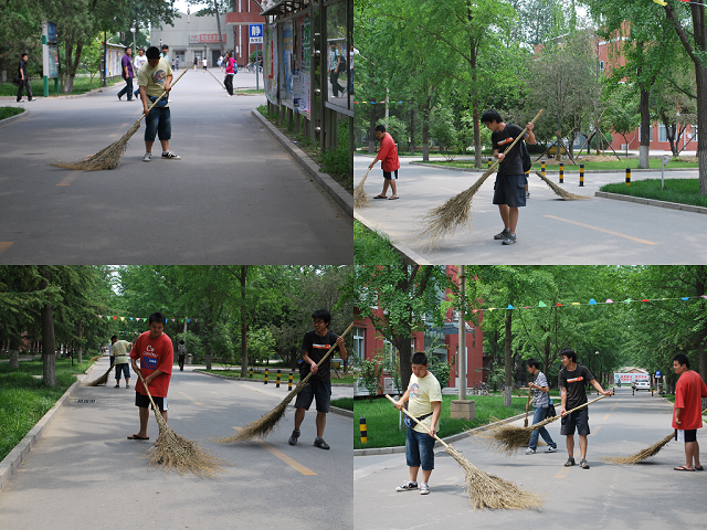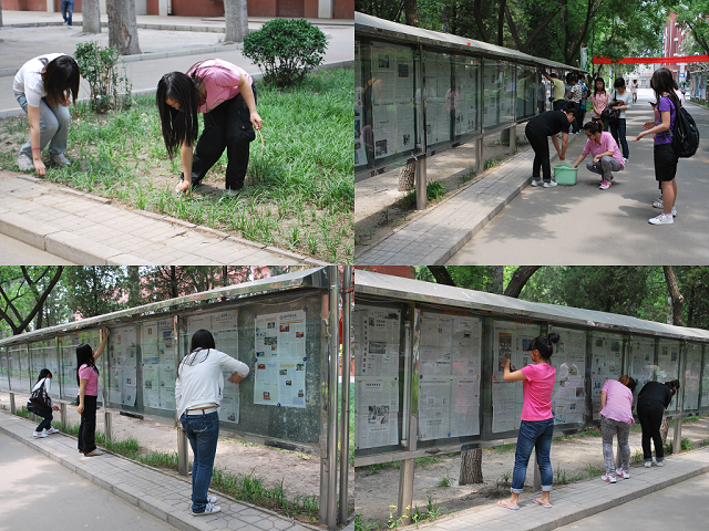 207232班的同学们男女分工。男生们拿着扫帚,沿着街道扫除地面垃圾。女生们有的拿着抹布将报刊栏的玻璃擦干净,有的捡起地面扫不到的垃圾。还有一部分同学清洗擦拭报刊公告栏。