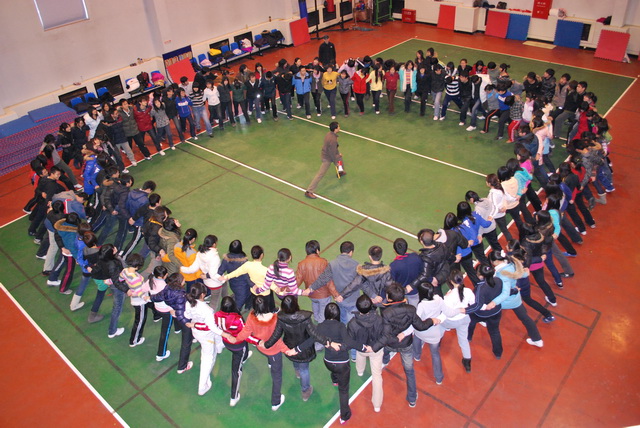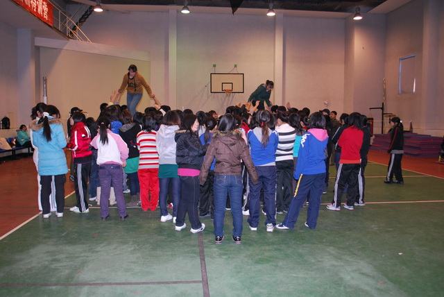 经过主管员工工作的副经理赵金芳老师和对方培训部主任黄鹏程老师的充分切磋协商制定了本次培训拓展方案。2010年1月5日上午8点30分,素质拓展项目在排球馆正式开始。培训部主任黄鹏程老师亲自带领培训团队一行四人组队训练。活动间歇,主管教学工作的副经理张喜春老师和培训老师进行了进一步的沟通,并对此次开展的培训拓展活动进行了肯定。