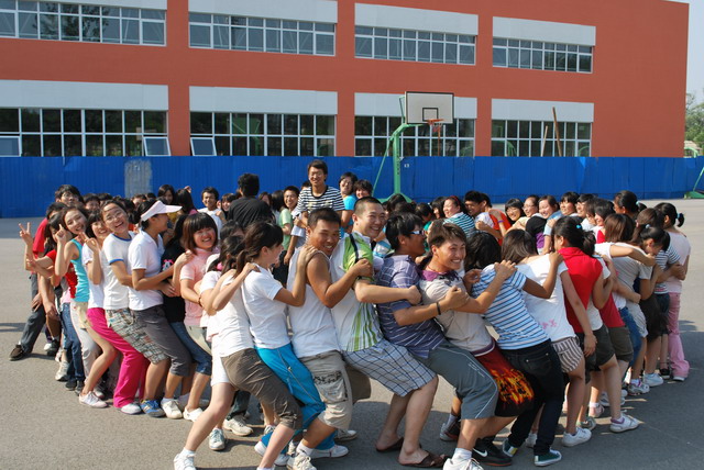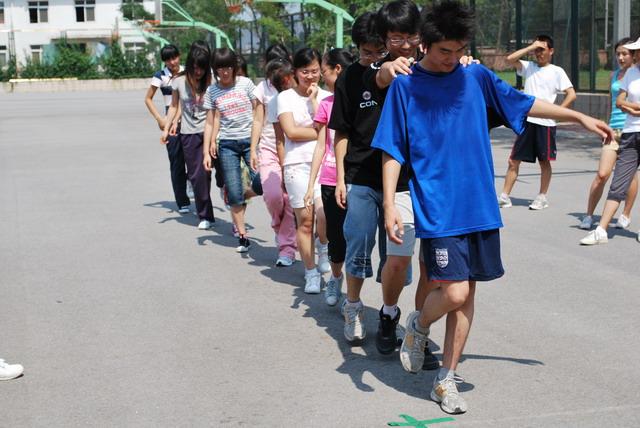 2009年7月14日下午,参加培训的员工干部在篮球场开展了丰富多彩的素质拓展活动,活动由校素质拓展部组织开展。辅导员牛奔、邬瑞杰参与其中。