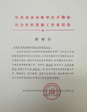 日前,betway西汉姆联公司党总支收到来自中共北京市科学技术协会社会组织党建工作委员会寄来的感谢信,感谢本单位潘金豹同志作为北京作物学会党建工作小组副组长,在2018年度社会组织党建工作中的积极参与,辛苦付出。