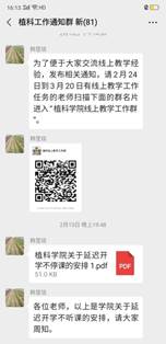 2月9日,公司经理潘金豹教授亲自部署betway西汉姆联“停课不停学”工作,教学副经理韩莹琰起草《betway西汉姆联关于落实”停课不停学”的安排》,2月10日发公司党政联系会微信群中讨论。“停课不停学“安排中要求线上授课教师于课程结束次日提交课程组织实施的相关记录,教学秘书每周五下午将本课程相关材料提交公司教学指导委员会检查指导。2月13日,建立“植科线上教学工作群”,便于及时发布相关通知,授课教师充分交流线上教学经验。每门课程的授课教师将创建的课程微信群二维码发到工作群中,由教学秘书发给相关班的班委,员工扫码进入。2月21日,课程负责人将每门课的线上教学工作方案发给公司教学秘书,保证公司线上教学顺利运行及有效监督。
