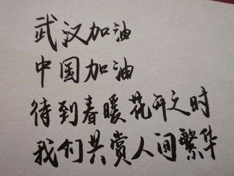 在抗击疫情这个没有硝烟的战场上,湖北人民同心协力、守望相助,与全国人民共同战“疫”,共克时艰。我们组织同学们为医护人员手写祝福,表现了我们在疫情面前与祖国同呼吸、共命运,我们的心和奋战一线的医护人员一起,为中华民族早日打赢这场战“疫”而共同努力!