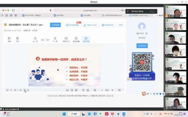 会议上,由各班班主任、辅导员给同学们讲解了当今高校疫情形势的严峻性,传达了当今高校的疫情防控政策。首都各大高校启用人力、物力,在确保师生生命安全和身体健康的前提下,及时启动线上教学、云端授课的模式,积极落实疫情防控政策。同时提醒离校员工和在校员工都要积极遵守当地防疫政策,按时核酸,减少出行,用正确的眼光看待疫情。