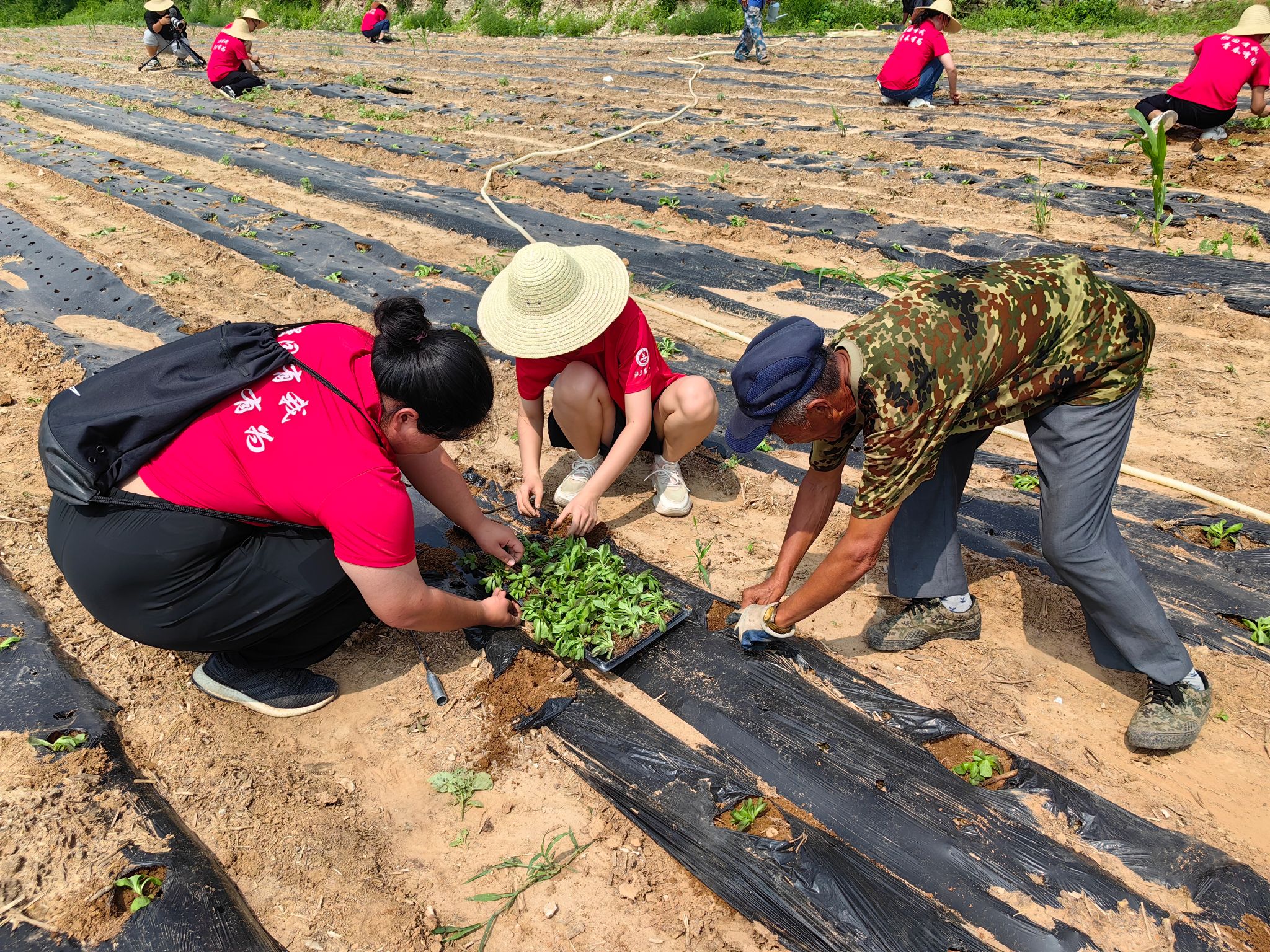 在韩莹琰教授的带领下,实践团在溜石港村北山坡梯田开展生菜科学移栽,在确保株行距和定植深度合理范围内,将绿色散叶生菜和紫色散叶生菜定植到梯田。