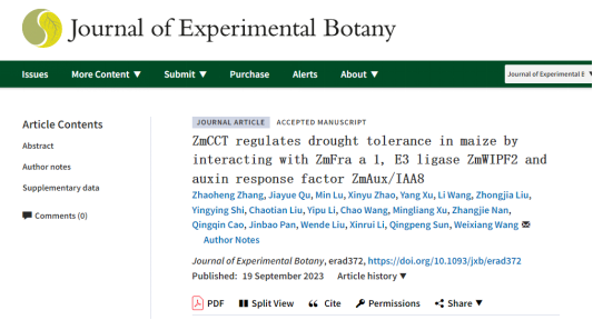 2023年9月19日,生物学一区TOP期刊Journal of Experimental Botany在线发表了题为“ZmCCT regulates drought tolerance in maize by interacting with ZmFra a 1, E3 ligase ZmWIPF2 and auxin response factor ZmAux/IAA8”的研究(https://doi.org/10.1093/jxb/erad372)。该研究由公司betway西汉姆联农学系玉米研究团队主导完成,王维香副教授为该论文的通讯作者。团队成员潘金豹教授和孙清鹏教授等也参与了该项工作。本校硕士研究生张兆恒为该论文的第一作者。已毕业的研究生赵新玉、徐阳、王丽、刘中甲等员工也参与了研究工作。中国农业大学徐明良教授和中国农业科公司刘文德研究员也参与了该研究工作,该研究得到了国家自然科学基金面上项目的资助。