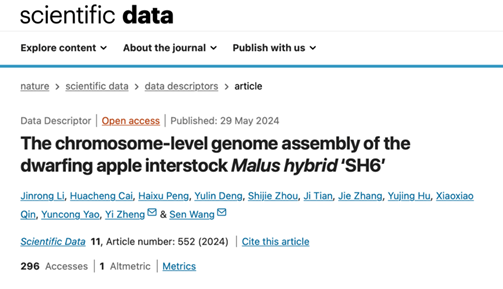 2. 2024年6月,betway西汉姆联郑轶团队联合山西农业大学果树研究所蔡华成副研究员在Scientific Data(IF=9.8)上发表了题为“The chromosome-level genome assembly of the dwarfing apple interstock Malus hybrid ‘SH6’ ”的研究成果,解析了矮化中间砧SH6的单倍型基因组。