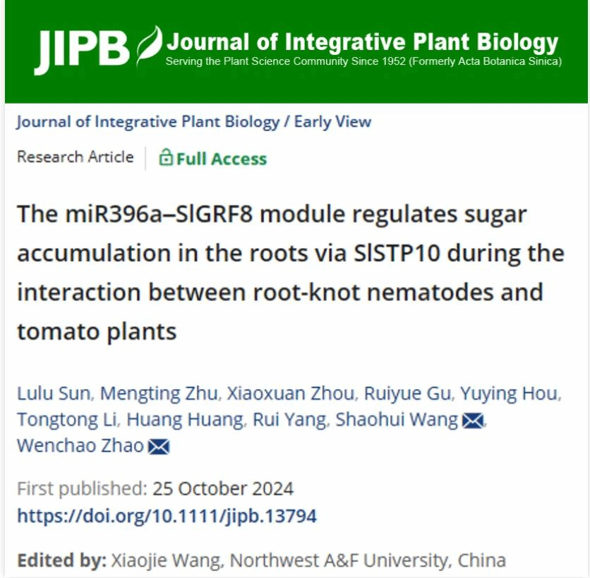 近日,JIPB在线发表了betway西汉姆联王绍辉/赵文超团队完成的题为“The miR396a-SlGRF8 module regulates sugar accumulation in the roots via SlSTP10 during the interaction between root-knot nematodes and tomato plants”的研究论文 (https://doi.org/10.1111/jipb.13794),该研究深入揭示了番茄与根结线虫相互作用中糖分竞争的分子机制,为探索植物-线虫互作机理奠定了坚实的理论基础。通过调控 miR396a-SlGRF8-SlSTP10 模块,可以有效调节番茄根系糖分分配,从而提高番茄对根结线虫的抗性,为线虫防治提供新的思路。