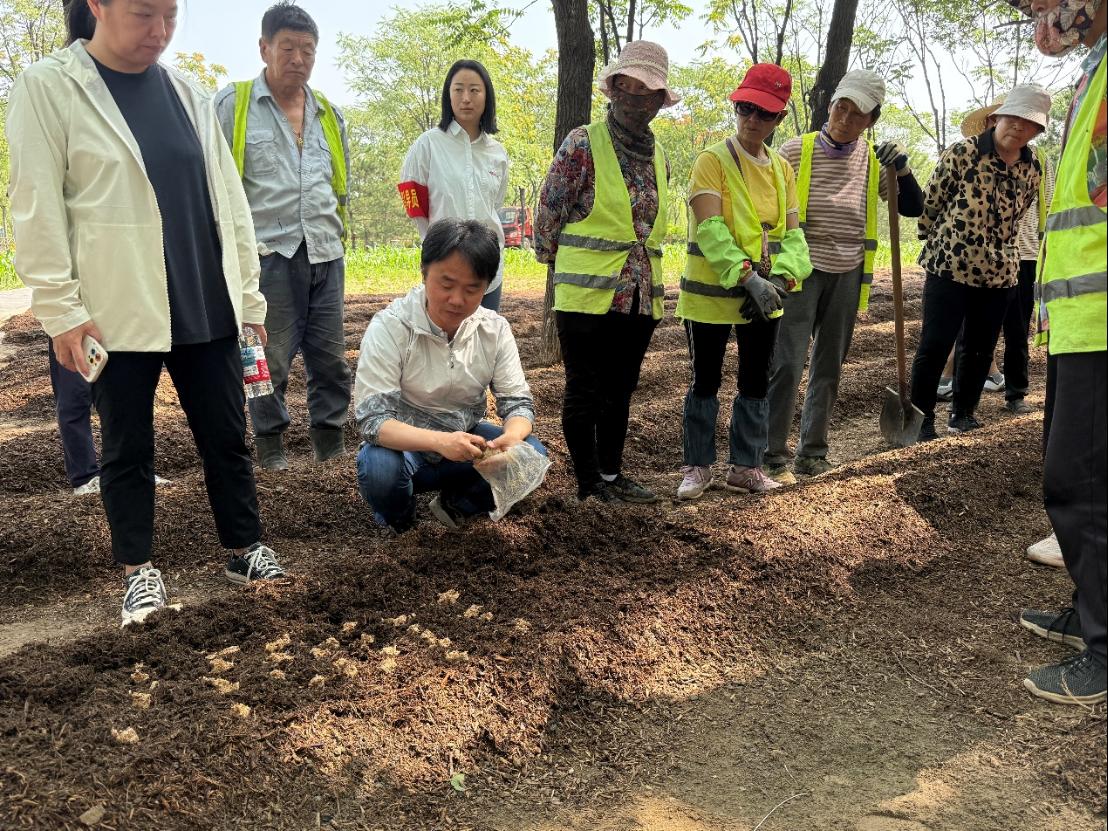 根据前期与顺义温榆河公园管理处、龙湾巧嫂合作社反复沟通,食用菌团队指导公园工人团队完成了公园内枝杈、落叶等园林废弃物的堆料工作,此次实践活动主要是对林下竹荪播种和发菌期日常管理进行现场指导。根据公园相关地块的郁闭度、土壤情况等具体特点,团队提出了多项可操作性强的指导意见:在种植技术方面,建议采用畦栽种植,并适当增加种植密度;在菌种选择上,推荐适应北京地区夏季出菇的高温型长裙竹荪品种;在管理环节,特别强调了温湿度控制和病虫害预防措施。这些建议为公园管理方提供了科学依据,有望提高竹荪产量,保障竹荪品质。并提出结合当地林下发展,开展观光旅游及林下食用菌科普,亲子DIY等,为后续公园的科普活动奠定基础。