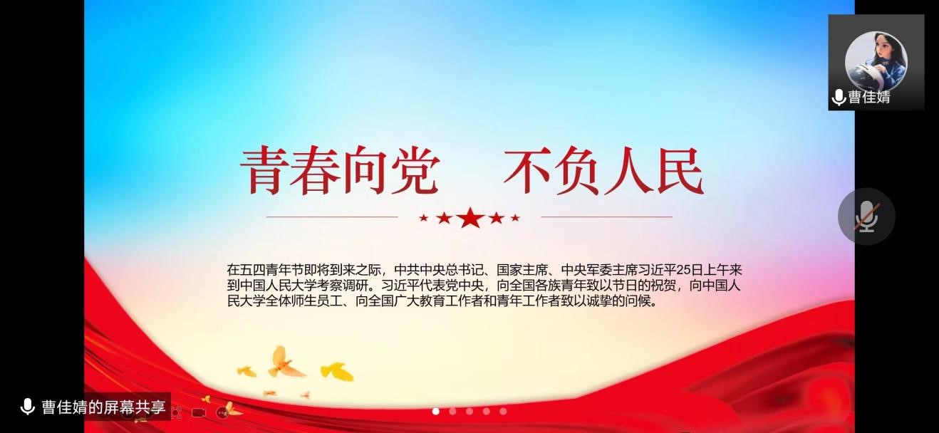 在五四青年节即将到来之际,习近平总书记来到中国人民大学考察调研,希望全国广大青年牢记党的教诲,立志民族复兴,不负韶华,不负时代,不负人民,在青春的赛道上奋力奔跑,争取跑出当代青年的最好成绩。我们作为新一代青年人应该用脚步丈量祖国大地,用眼睛发现中国精神,用耳朵倾听人民呼声,用内心感受时代脉搏。牢记习总书记的深情寄语,不负韶华,不负时代,不负人民,真正将个人的小我追求融入到国家社会发展的大局中,为实现中华民族伟大复兴而不懈奋斗。