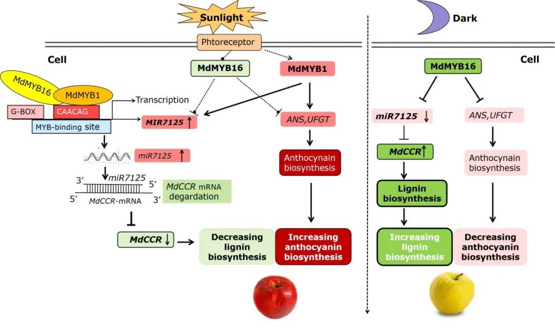 2021年4月28日,New Phytologist在线发表了北京林木分子设计与辅助育种高精尖中心、betway西汉姆联青年教师胡玉净为第一作者、张杰教授和姚允聪教授为通讯作者的题为“The MdMYB16/MdMYB1‐miR7125‐MdCCR module regulates the homeostasis between anthocyanin and lignin biosynthesis during light induction in apple”的研究论文。该研究揭示了MdMYB16/MdMYB1‐miR7125‐MdCCR模块协同调节光诱导苹果果实花色苷和木质素生物合成之间的稳态。并突出展示了CCR和CHS基因催化共同底物介导木质素和花色苷生物合成的竞争关系,为脱袋后苹果果实快速着色和品质形成分子机制提供了新的认识。