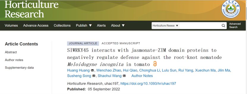近日,Horticulture Research上线了(Advance Access)betway西汉姆联王绍辉教授团队题为SlWRKY45 interacts with jasmonate-ZIM domain proteins to negatively regulate defense against the root-knot nematodeMeloidogyne incognitain tomato的研究论文,该论文揭示了转录因子SlWRKY45参加茉莉素合成和信号转导途径负调控番茄对南方根结线虫的抗性。
