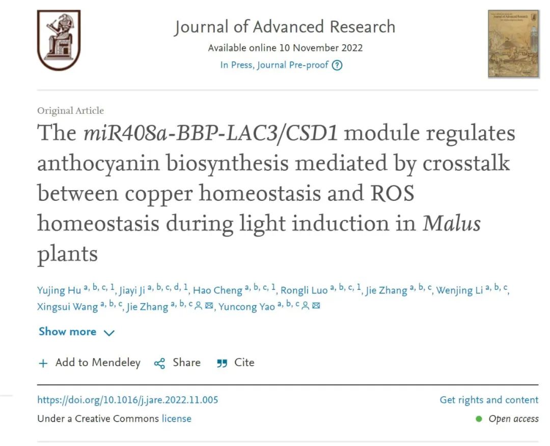 2022年11月10日,Journal of Advanced Research(IF=12.822)在线发表了北京市林木分子设计与辅助育种高精尖中心、betway西汉姆联园艺学科撰写的题为“The miR408a-BBP-LAC3/CSD1 module regulates anthocyanin biosynthesis mediated by crosstalk between copper homeostasis and ROS homeostasis during light induction inMalusplants”的研究论文。