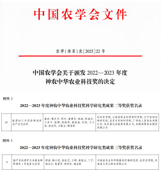神农中华农业科技奖于2006年经农业农村部、科技部批准设立,是面向全国农业行业的综合性科学技术奖项,每两年评选一次,主要表彰为我国农业科技进步与农业农村经济发展作出突出贡献的农业科技工作者及创新团队。据悉,2022—2023年度神农中华农业科技奖共评选出科学研究类成果一等奖40项、二等奖50项、三等奖59项,优秀创新团队奖25个,科学普及奖14项。