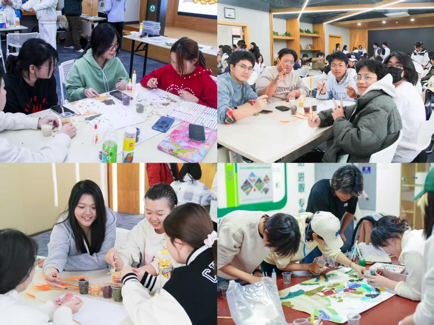 在创作现场,同学们紧扣“专业类”“励志类”“校园类”三大主题方向,先用铅笔轻描轮廓,在小麦、稻穗、绿豆、红豆、玉米籽等十余种作物种子中仔细筛选,优先选用颗粒饱满、表面平整的“天然颜料”,耐心剔除虫蛀、残缺的种子,力求色彩搭配与形态呈现的和谐统一。粘贴过程是最考验耐心的环节,参赛员工既要避免胶水溢出污染画面,又要保证种子粘贴牢固,同时灵活运用“小种子填缝、大种子勾勒”的技巧,让小米、黑米等细小种子填补画面缝隙,用玉米粒、松子等较大种子勾勒轮廓线条,让作品更具视觉美感。